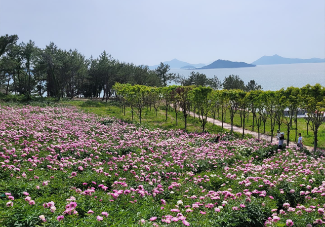 약 22.헥타르 규모의 군락지에 8개 품종, 28만 본의 작약이 식재되어 바다와 꽃이 어우러진 장관을 만날 수 있습니다.